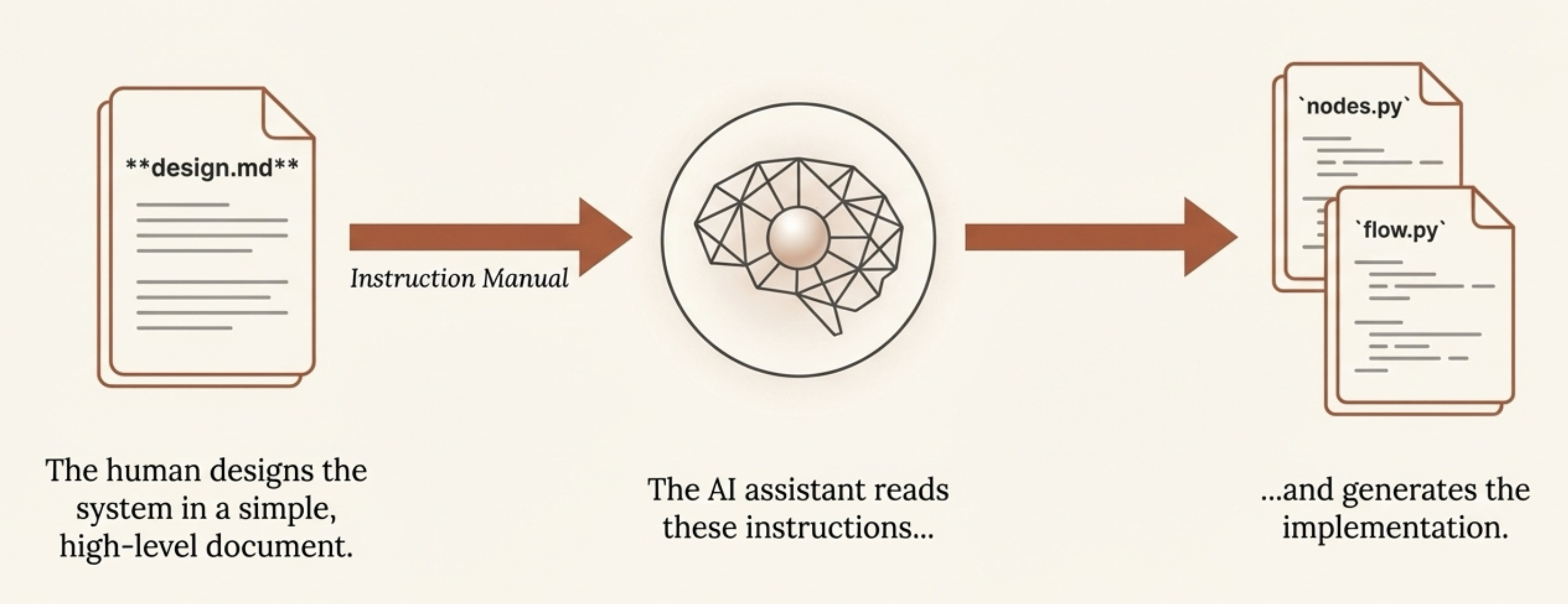 The key mechanism making this possible is âDocumentation as the second codebase.â This is where the minimalist design shines. The simplicity of the Node/Flow/Shared Store model is precisely what makes it legible to an AI agent. A complex, 100,000-line framework is a black box, but a system built on these simple, documented primitives becomes an instruction manual for an AI partner.