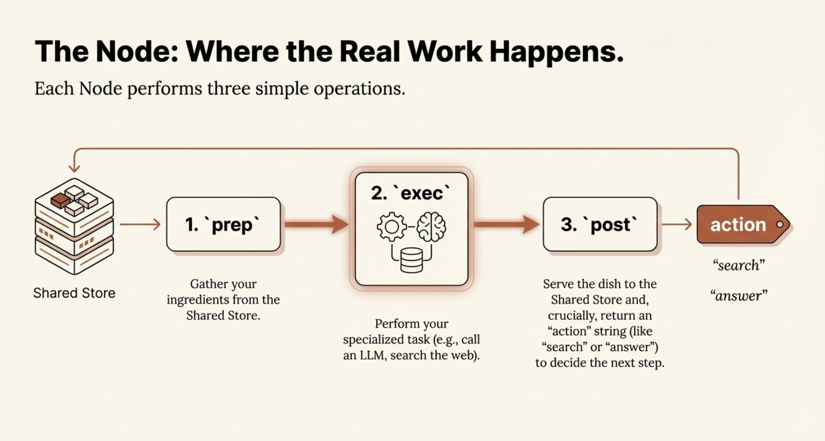 prep (gather ingredients),Âexec (perform the task), andÂpost (serve the dish and decide what to make next). Crucially, theÂpost method returns an âactionâ string (likeÂ"search" orÂ"answer"() that determines the next step, enabling dynamic, agent-like decision-making. - Flow: This is the recipe that directs the entire process. It reads the action from the previous Node and dictates which station to visit next. For example, âIf theÂ