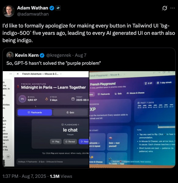 In August 2025, Adam Wathan posted an apology on X that got over 1 million views. He apologized for making every button in Tailwind UI use bg-indigo-500 five years ago, which caused every AI-generated interface on Earth to turn purple.