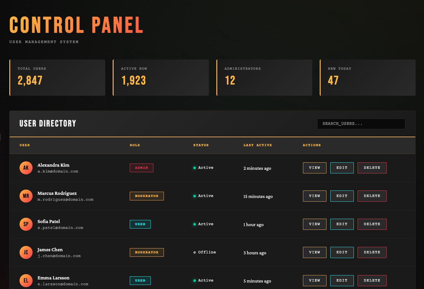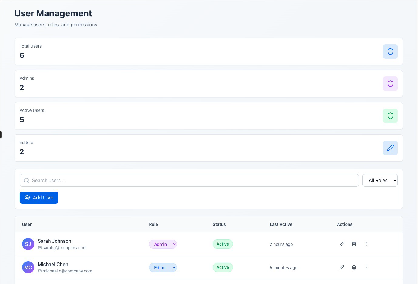 Prompt: Create an admin panel with a data table showing users, their roles, and action buttons